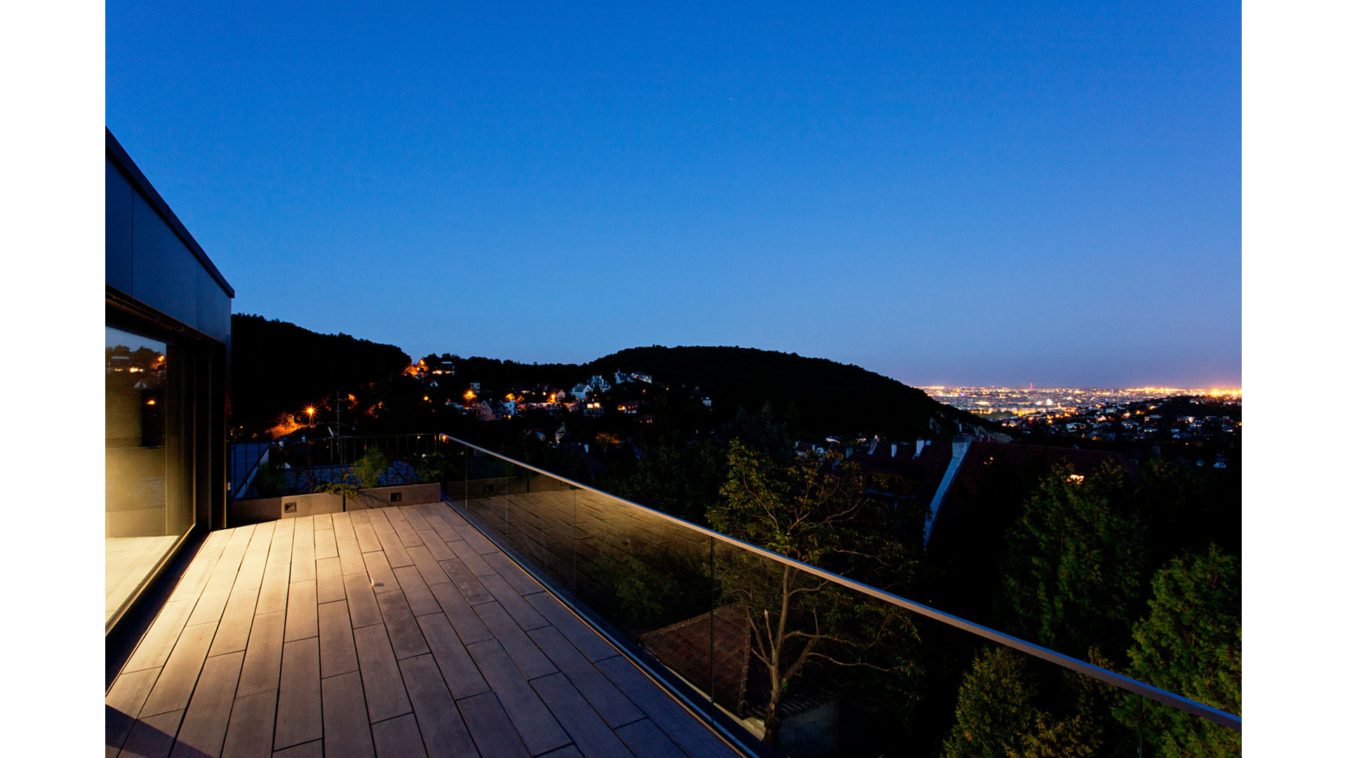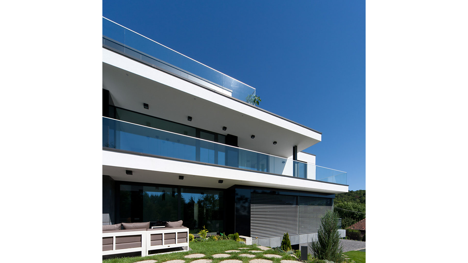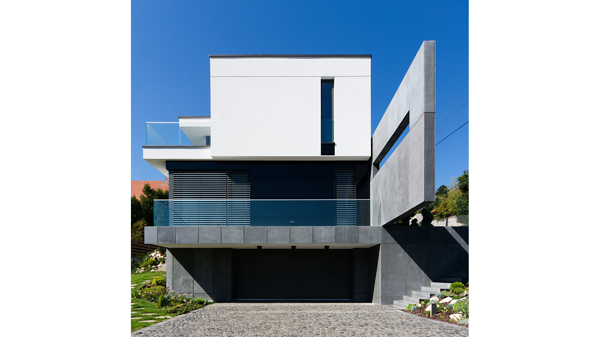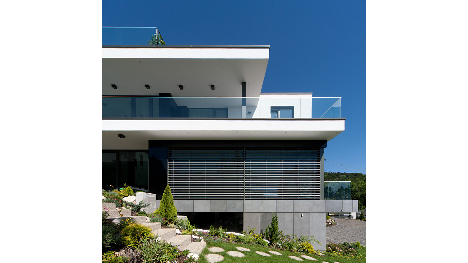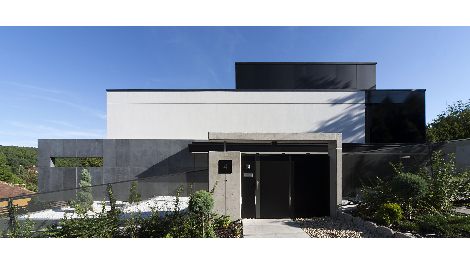 315 m2, lebegő tömegek, terepre illesztve, utca felé zárt telepítés, tetőfelépítmény pazar kilátással