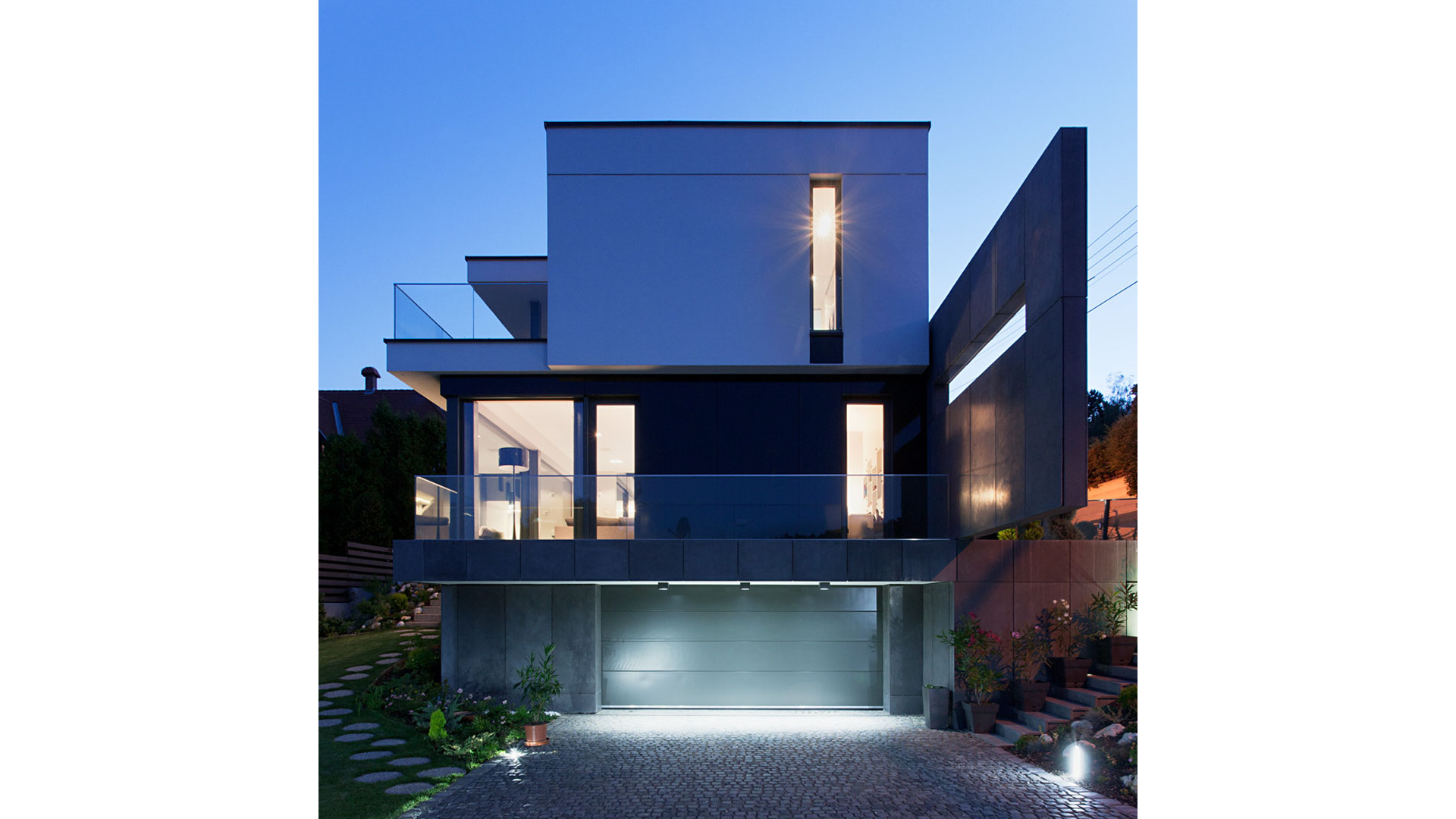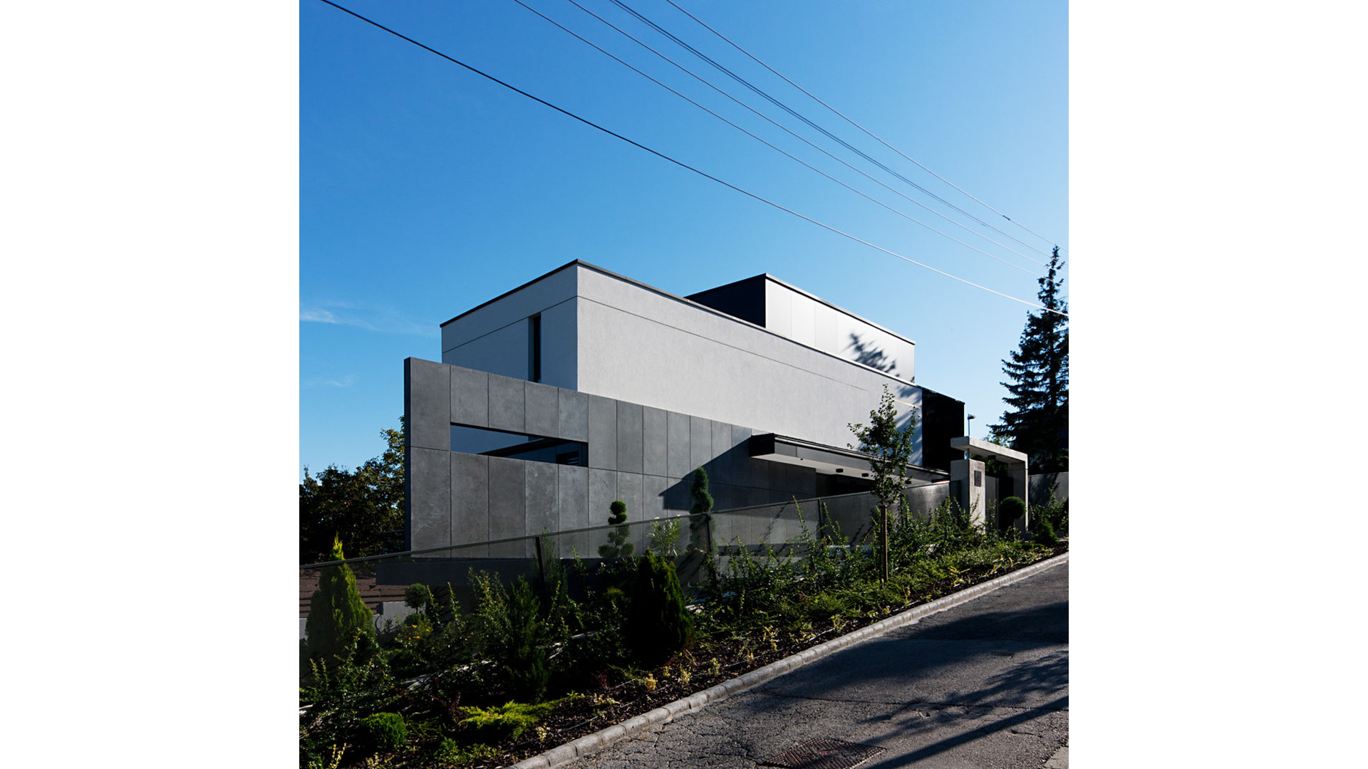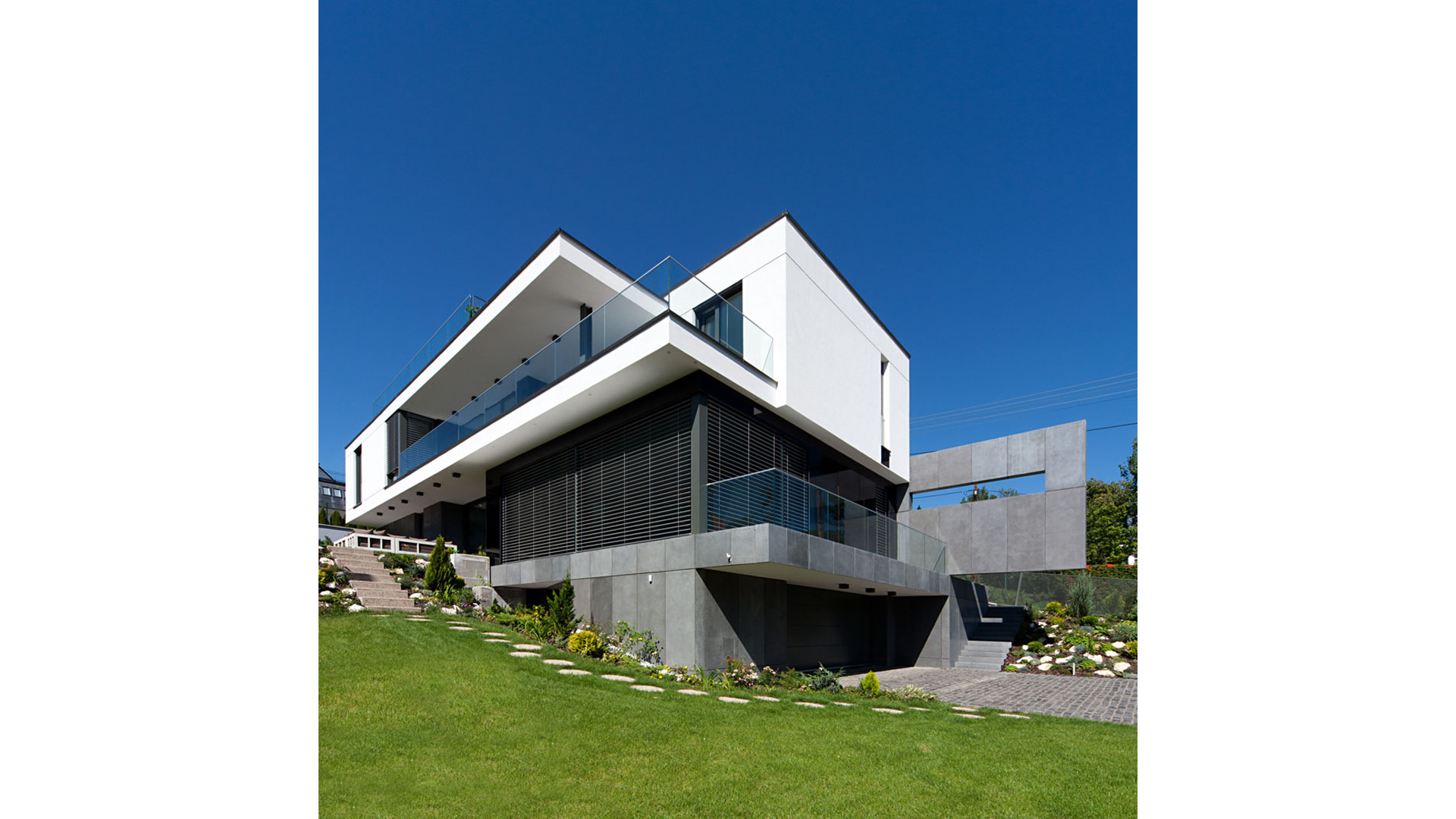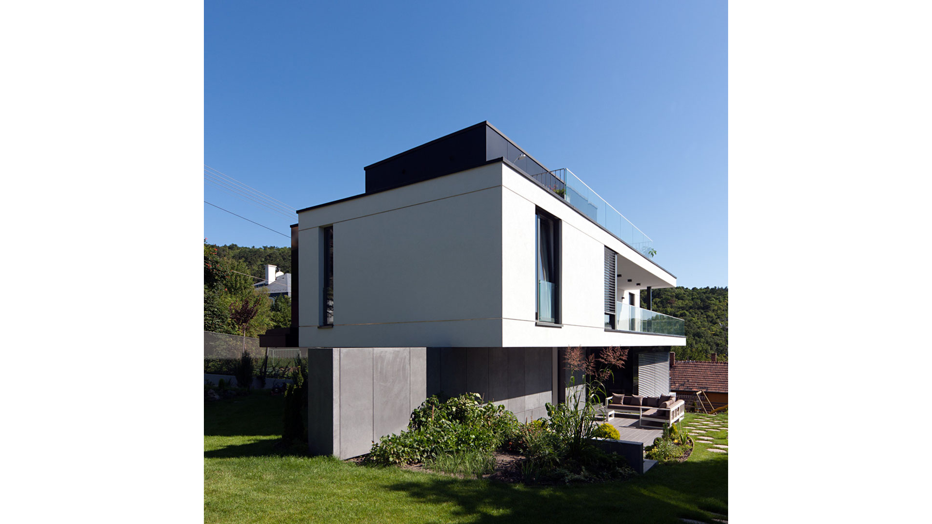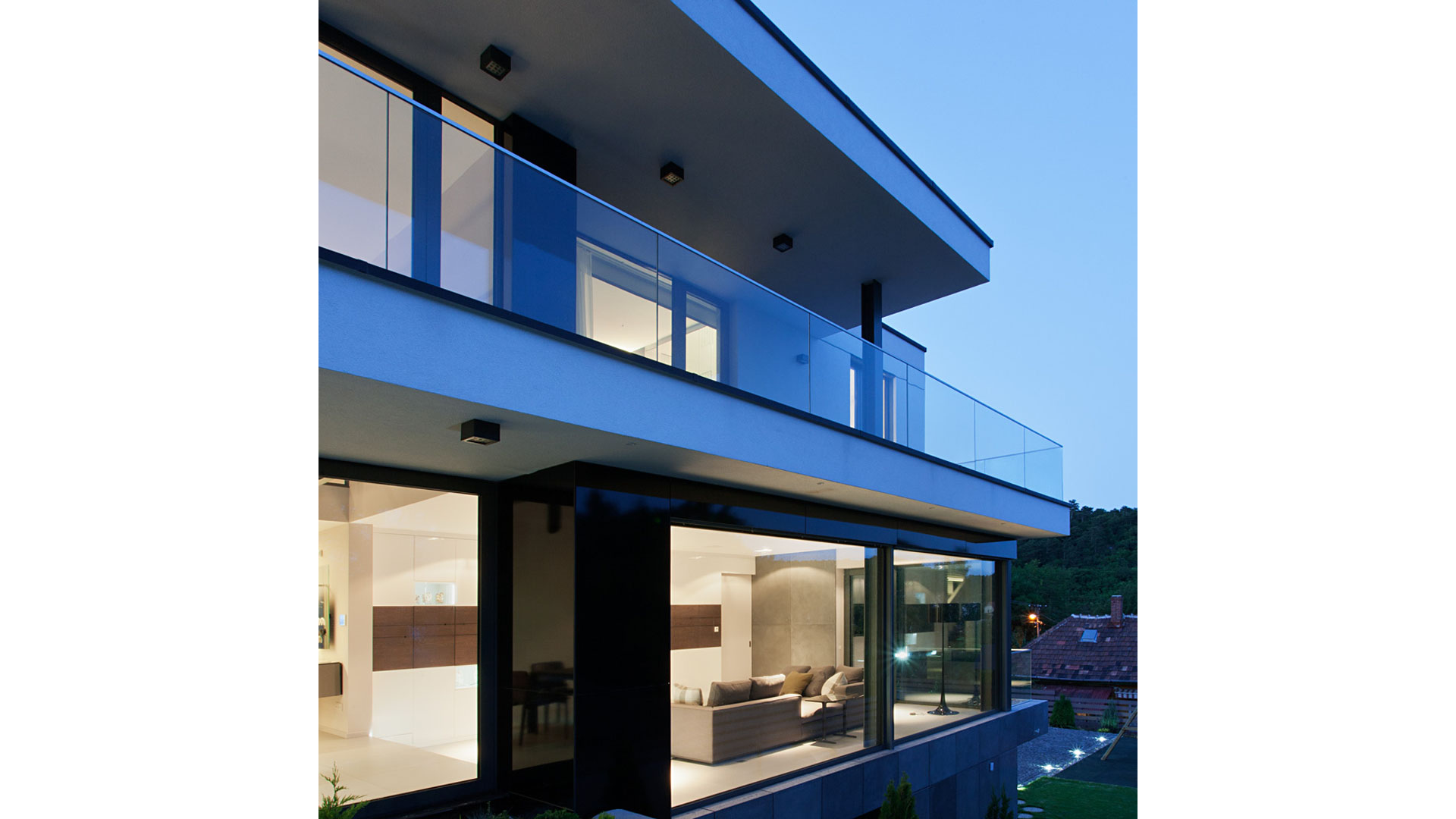 315 m2, lebegő tömegek, terepre illesztve, utca felé zárt telepítés, tetőfelépítmény pazar kilátással
