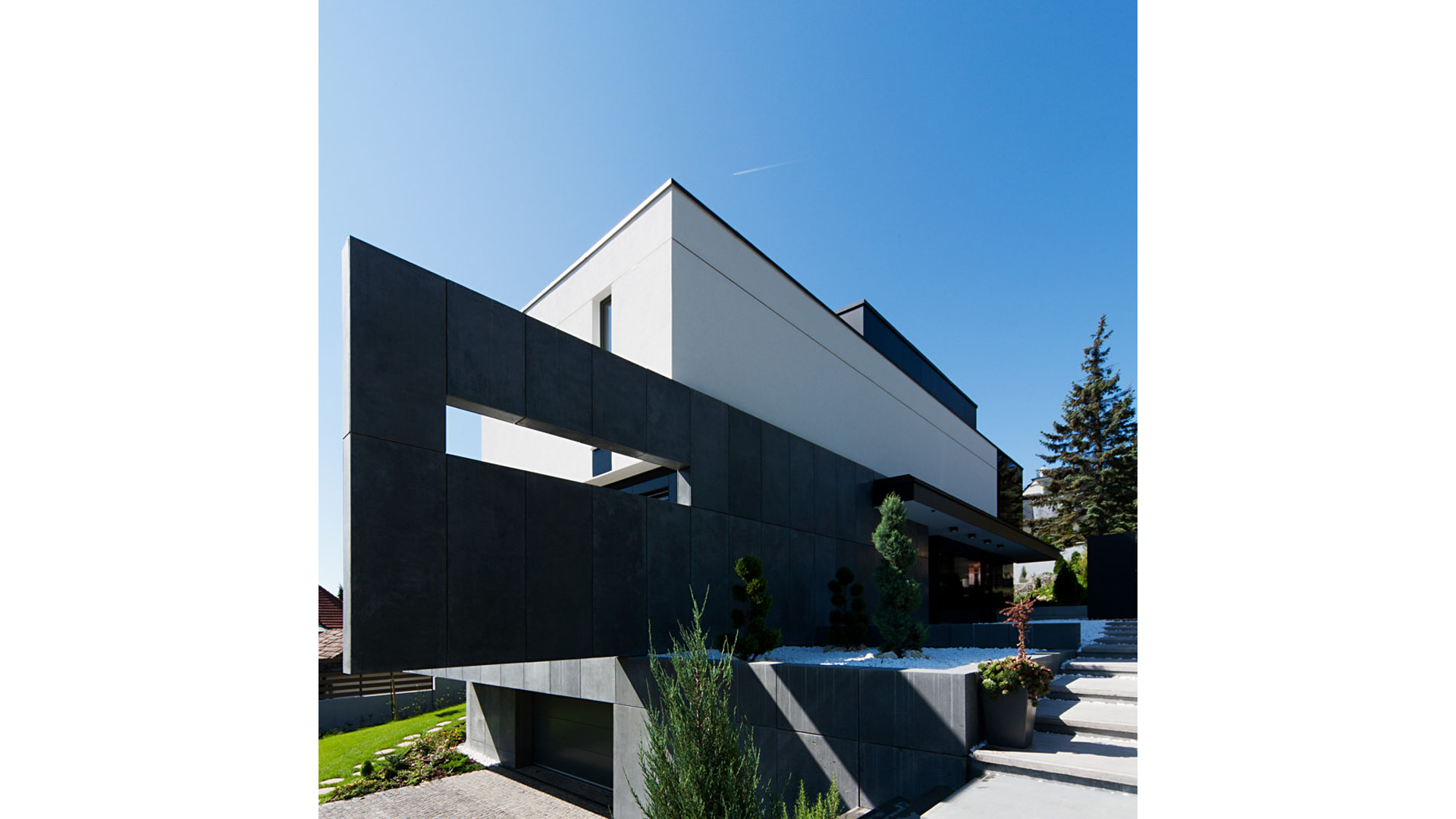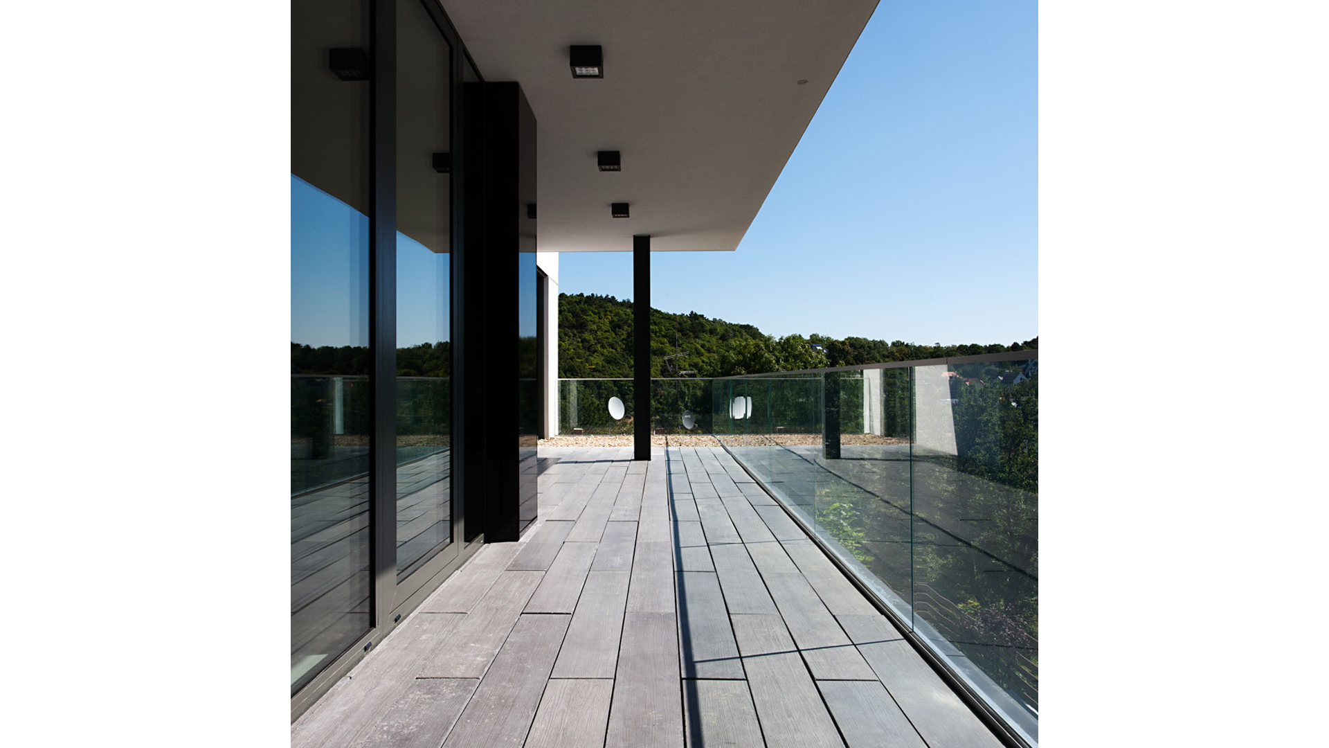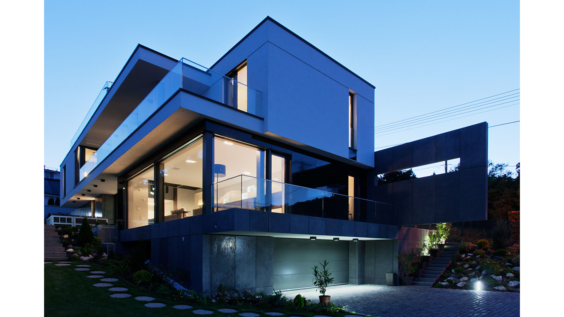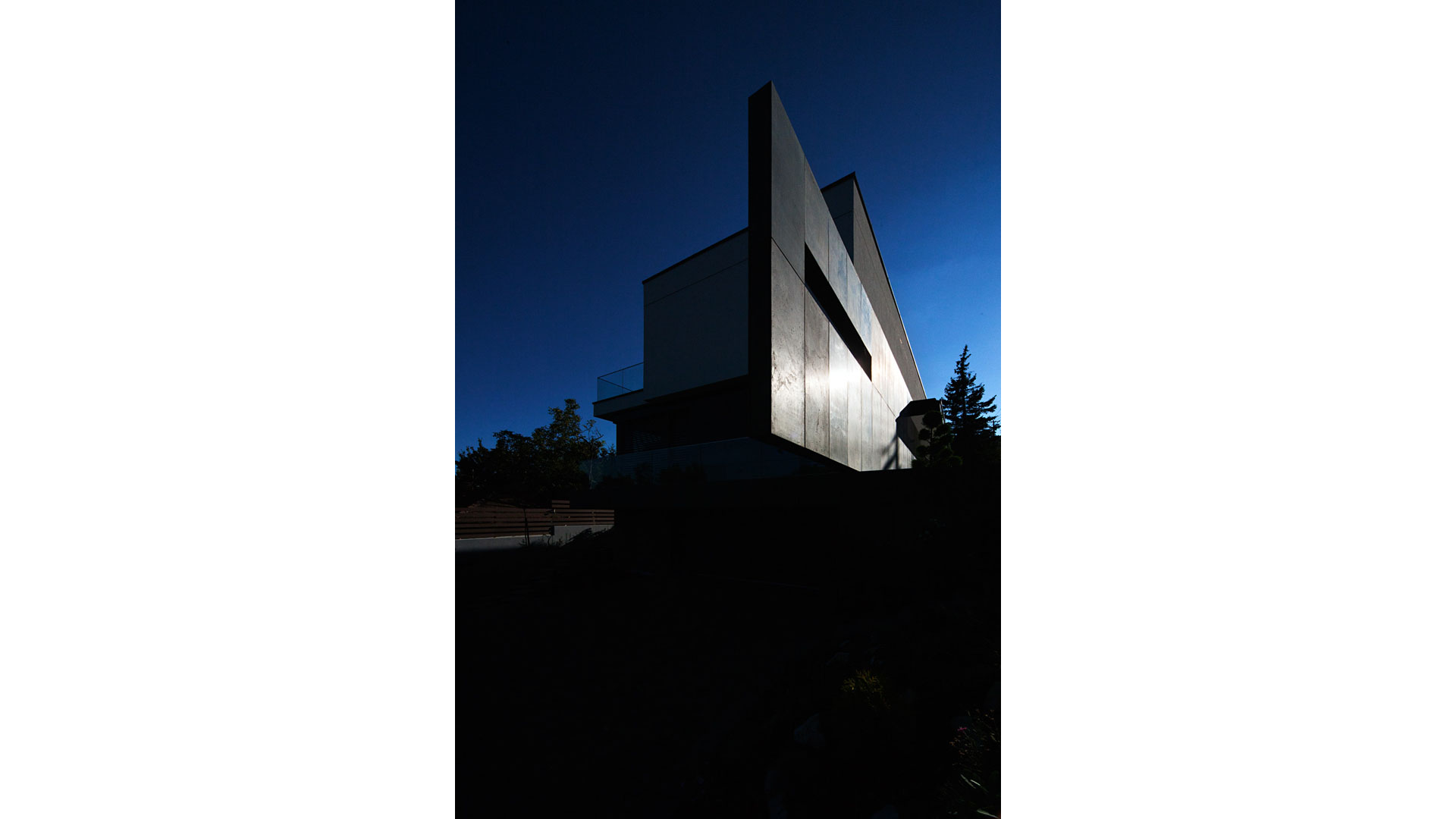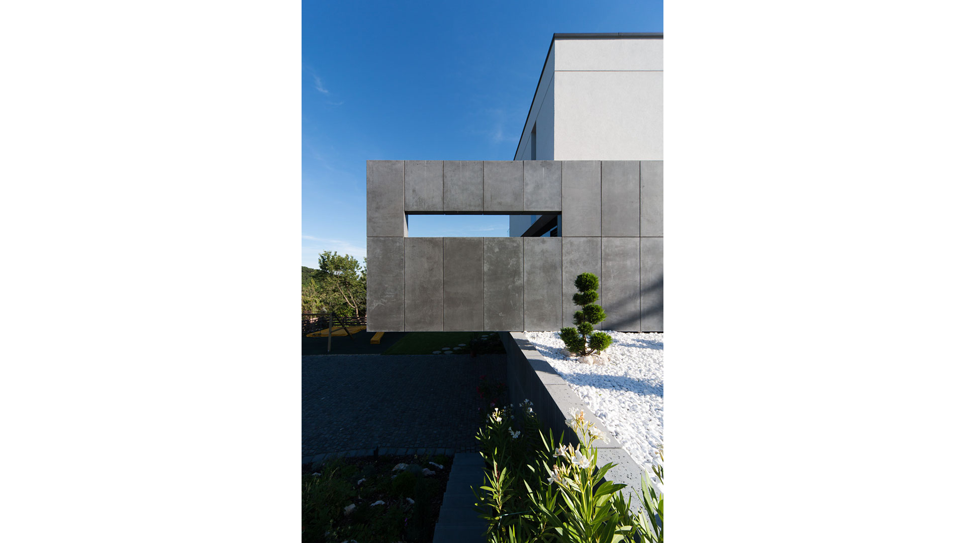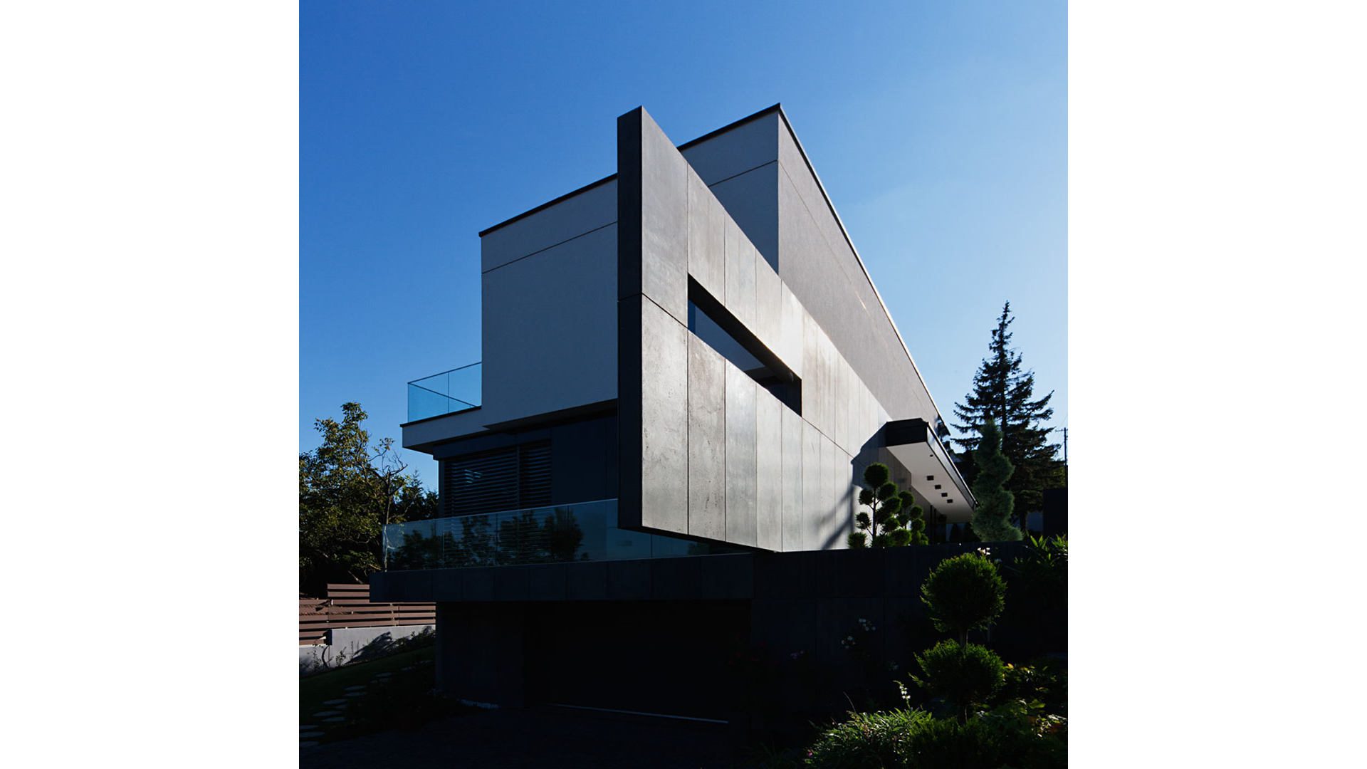 315 m2, lebegő tömegek, terepre illesztve, utca felé zárt telepítés, tetőfelépítmény pazar kilátással